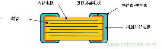 GCJ系列和KCM/KC3系列的構造圖如圖4所示。GCJ系列,其外部電極的基極電極和電鍍鎳/錫電極中間有一層樹脂電極。由于樹脂的彈性吸收了電路板的偏轉應力,并且,樹脂外部電極相對減弱了裂紋對陶瓷造成的破壞力,可以緩和電路板的偏轉應力。