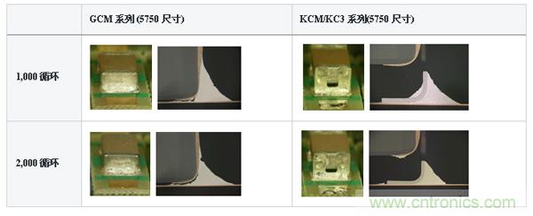 此外,KCM/KC3系列除了電路板的偏轉應力,由于熱機械應力,有可能達到改善焊接裂縫的產品。圖11中表示的是KCM/KC3系列的溫度循環后的橫截面圖片。