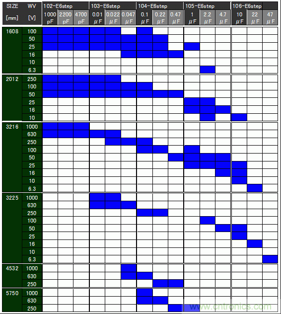 GCJ系列1608-5750尺寸、6.3V-1,000V正在商品化。此外,這里沒有表示出的150°C高溫環境下使用的產品也在商品化中。