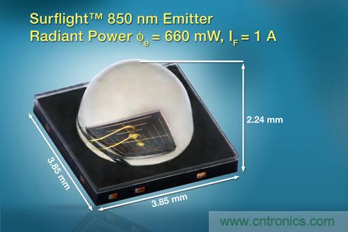 【導讀】日前,Vishay推出新款850 nm紅外發射器,它的尺寸為3.85mm x 3.85mm x 2.24mm的器件采用頂視SMD封裝,在1A下的發光強度為350mW/sr,光功率達660mW,熱阻低至10K/W。新款發射器適用于CCTV、游戲和公路收費系統中的紅外照明,以及長距離的測距應用。