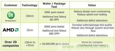 事實(shí)證明,單元識別 ATPG 測試法是唯一可以發(fā)現(xiàn)傳統(tǒng)方法檢測不出的缺陷的方法。它可以發(fā)現(xiàn)一套完整的針對固定故障、節(jié)點(diǎn)跳變和時(shí)延缺陷的測試方法發(fā)現(xiàn)不了的缺陷,因?yàn)檫@種方法首先就對標(biāo)準(zhǔn)單元進(jìn)行物理布局時(shí)可能出現(xiàn)的實(shí)際缺陷進(jìn)行模擬。在新技術(shù)的改進(jìn)下,單元識別測試法中的測試向量大小得以縮小,但整個(gè)測試向量仍大于傳統(tǒng)的測試方法產(chǎn)生的測試向量,因此要進(jìn)行嵌入式壓縮。許多公司因?yàn)椴捎脝卧R別測試法而收效顯著。部分成效的概述請見圖1。