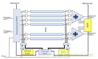 圖2:混合壓縮邏輯架構(gòu)和邏輯內(nèi)建自測試共享大部分解壓單元/LFSR 和壓縮單元/MSIR 邏輯。