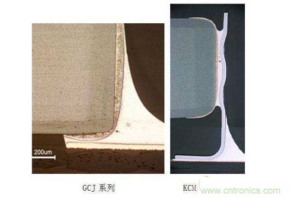 GCJ系列和KCM/KC3系列的構造圖如圖3所示。GCJ系列,其外部電極的基極電極和電鍍鎳/錫電極中間有一層樹脂電極。由于樹脂的彈性吸收了電路板的偏轉應力,并且,樹脂外部電極相對減弱了裂紋對陶瓷造成的破壞力,可以緩和電路板的偏轉應力。