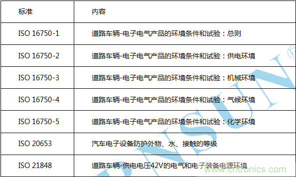ISO 16750 系列標(biāo)準(zhǔn)是國際標(biāo)準(zhǔn)化組織ISO 最近幾年推出的針對汽車電子的環(huán)境可靠性標(biāo)準(zhǔn),該標(biāo)準(zhǔn)是歐系車常用的標(biāo)準(zhǔn),并且逐漸被世界各國轉(zhuǎn)化為國家標(biāo)準(zhǔn),也逐漸被各企業(yè)標(biāo)準(zhǔn)所引用,成為應(yīng)用比較廣泛的汽車電子的環(huán)境可靠性標(biāo)準(zhǔn)。該系列標(biāo)準(zhǔn)包括五個(gè)部分: