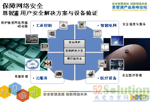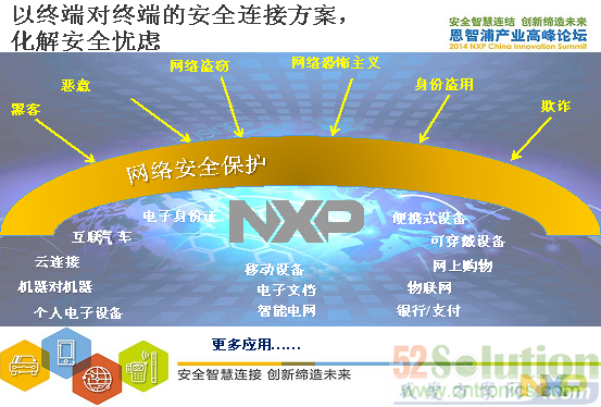 從以上圖中可以看到NXP保障網絡安全的方案,從工業控制,智能電網,醫療設備和云服務方面。另外,NXP也提供以終端對終端的安全連接方案在互聯汽車、物聯網和便攜的可穿戴式應用。