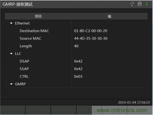 接收測(cè)試頁(yè)面用于接收來(lái)自其他設(shè)備發(fā)送的GMRP報(bào)文。界面枚舉出報(bào)文類型,以及組播地址。并且對(duì)報(bào)文內(nèi)容也可以做到解析。如圖 1-4所示: