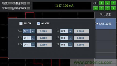 在儀器接有外部傳感器或測試線時,可以用NULL功能減去偏置電壓,即去除測量信號中的直流分量。請在無輸入狀態下(電流輸入端子開放,電壓輸入端子短路)執行NULL功能。