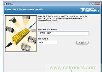 啟動Masurement & Automation Explorer軟件,選擇設備和接口,在添加網絡設備中,使用Manual Entry of Raw Scoket(手動輸入原始SOCKET)方式連接,ZDS2024示波器采用端口號5025來接收SCPI命令。如圖2和圖3所示。設置好后,可進行測試,確保連接成功。