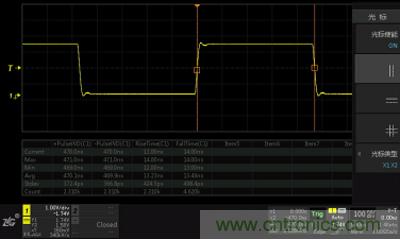 為什么會出現這種情況呢?示波器自動測量的門限是為Vtop與Vbase之間50%的位置,所以測量的結果也是以50%處為準,這種測量方法也更為科學。在用光標測量時,如果將測量點選在Vtop與Vbase的50%處,這樣測出的結果便和自動測量結果相差無幾了。如下圖,光標測量470ns,自動測量470.1ns。