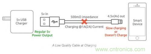 還拿上面那個(gè)例子來(lái)解釋?zhuān)?A充電電流下,會(huì)產(chǎn)生1V的電壓降,設(shè)備端充電電壓僅為4V。除了可能會(huì)帶來(lái)安全性問(wèn)題之外,對(duì)智能設(shè)備而言,這么低的電壓甚至無(wú)法對(duì)設(shè)備充電。