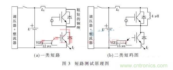 圖3(a)為一類短路測試原理圖,電網(wǎng)電壓經(jīng)過調(diào)壓器和整流橋,將母線電容電壓充到1 500 V,上管igbt的門極被-15 V關斷,且用粗短的銅排將其短路。對下管的IGBT釋放一個12 μs的單脈沖,直通就形成一類短路。圖3(b)為二類短路測試原理圖,將母線電容電壓同樣充到1 500 V,上管IGBT的門極被-15 V關斷,且給上管并聯(lián)一個4 μH的電感作為負載,下橋臂通過IGBT驅(qū)動器釋放一個15 μs的單脈沖就形成二類短路。