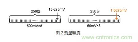 一般數(shù)字示波器采用的都是8位ADC,對(duì)任何一個(gè)波形值都是用256個(gè)0和1來重組。假設(shè)示波器垂直方向滿量程為8格,對(duì)應(yīng)量化級(jí)數(shù)256。在垂直檔位為500mV/div的情況下,垂直精度為(500mV*8)/256=15.625 mV。測(cè)量同一個(gè)信號(hào),在垂直檔位為50mV/div的情況下,即(50mV*8)/256=1.5625 mV,垂直精度就達(dá)到了1.5625 mV。