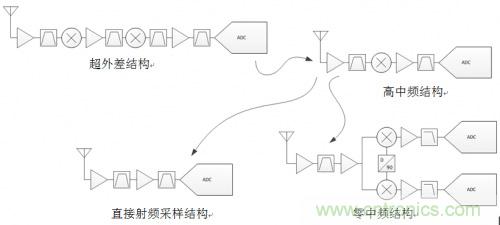 十年前,大多數無線電設備建立在較為基礎的超外差結構上,且具有多個下變頻級。當時,我們見證了高 IF (中頻) 結構中出現(xiàn)單個下變頻級的變化。這得益于ADC帶寬、采樣速率與性能等的顯著改善,這些顯著的改善使第二或第三奈奎斯特區(qū)域的信號采樣得以實現(xiàn)。ADS62P45 ADC便是引領這次變化的一個典型代表。現(xiàn)在,ADC技術進一步得到改進與提升,使得無線電中最后一個下變頻級也得以消除,從而支持直接射頻(RF)采樣接收機。參見圖1。