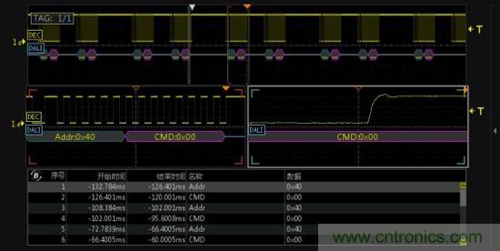 對長時間監測的數據進行異常分析,可在示波器的縮放模式下使用雙ZOOM多窗口顯示的功能,對信號進行多窗口異常監測和分析,可同時對任一數據幀和數椐幀上升沿或下降沿細節進行分析,然后通過查看放大數椐細節,事件表中的數據和波形一一對應,定位異常非常方便,如下圖7所示。