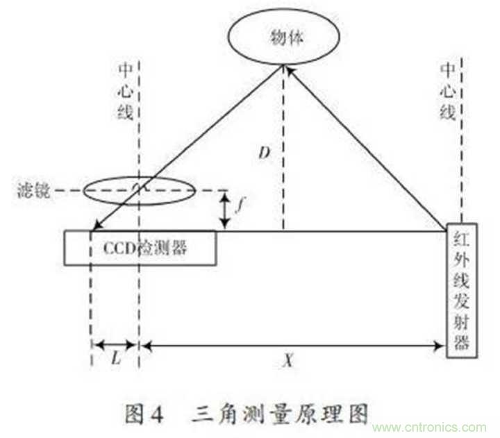 紅外感應(yīng)器包含紅外發(fā)射器與CCD檢測(cè)器,紅外線發(fā)射器會(huì)發(fā)射紅外線,紅外線在物體上會(huì)發(fā)生反射,反射的光線被CCD檢測(cè)器接收之后,由于物體的距離D不同,反射角度也會(huì)不同,不同的反射角度會(huì)產(chǎn)生不同的偏移值L,知道了這些數(shù)據(jù)再經(jīng)過計(jì)算,就能得出物體的距離了,如下圖所示。