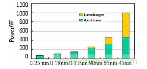 在深亞微米工藝下,電路的功耗主要是跳變功耗,短路功耗和漏電功耗可以忽略不計。但隨著工藝發展到納米級,漏電功耗在整個功耗中的比例將顯著提高(如下圖所示)。