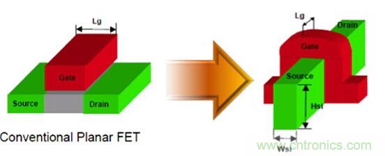 如前面所說,柵極越窄,即納米數越低,功耗和性能都有明顯收益。但是凡事都有兩面,有收益就會有代價。上圖左圖(即前面那張圖的結構)中的紅色柵極越窄,則柵極接觸下面的面積就越小。前面說了,綠色源漏(SD)兩極的通斷是靠柵極通電壓控制的,但是面積越小這個柵極的控制力越弱,這就會導致出現兩極之間的漏電越來越大。這個問題在20nm時達到了一個很大的值,對功耗影響很大。所以早在10年前,就有人提出了右圖中的3D晶體管的新結構。由于這個結構看上去像張開的魚鰭,所以被叫做FinFET技術。FinFET技術最主要的好處是紅色的柵極變成三面環繞綠色SD兩極之間的通道了,這樣柵極就又重新具備了對這個通道的強力控制力,原先通過減小柵極寬度的方法就可以繼續了。有人可能會有疑問,十年前就提出為什么現在才用,其實概念到實施不是那么容易的。大家腦補一下這個結構是在20nm的范圍里做的,導致工藝要多出十幾二十層來,這不僅是難度,也是成本。