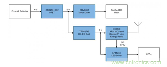 電機(jī)驅(qū)動器:驅(qū)動電流、電源電壓范圍、負(fù)載電機(jī)類型和安全關(guān)閉功能都是選擇電機(jī)驅(qū)動器時的因素。DRV8833可以驅(qū)動多種類型的電機(jī)和感性負(fù)載,峰值電流為2A,電源電壓范圍為2.7V至10.8V,非常適合使用四節(jié)AA電池。標(biāo)稱驅(qū)動電壓電池的電壓是5V。