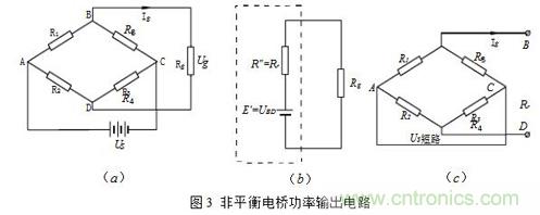 (3)Rg相對(duì)橋臂電阻可比擬時(shí)的非平衡電橋(功率輸出形式)當(dāng)負(fù)載電阻Rg與橋臂電阻可比擬時(shí),則電橋不僅有輸出電壓Ug,也有輸出電流Ig,也就是說(shuō)有輸出功率,此種電橋也稱為功率橋。功率橋可以表示為圖3(a)。