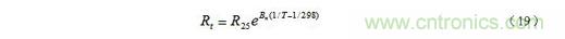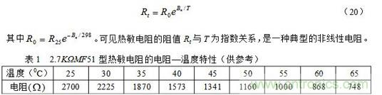 其中R25和Rt分別為25℃和t℃時(shí)熱敏電阻的阻值,T = 273 + t;Bn為材料常數(shù),其值因制作時(shí)不同的處理方法而異,對(duì)確定的熱敏電阻,可以由實(shí)驗(yàn)測(cè)得的電阻—溫度曲線求得。我們也可以把(19)式寫成比較簡(jiǎn)單的表達(dá)式