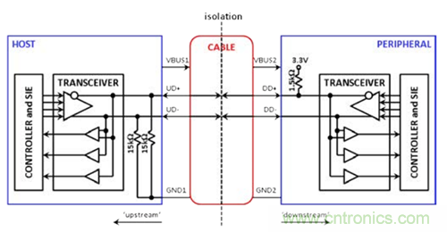 一種可能的隔離方法如圖2a所示。圖中,虛線表示隔離在理論上將USB電纜分割。D+和D–的狀態(tài)信息可以跨越隔離柵,但電流不能。GND1節(jié)點(上游的接地基準)現(xiàn)在與GND2節(jié)點(下游的接地基準)相互分離。不幸的是,隔離使主機無法“看到”下游的上拉電阻,而外設無法“看到”上游的下拉電阻。因此,需要使用一些額外的電阻,如圖2b所示,以便跨越隔離模仿相應連接。在這個“透明”概念中,主機與外設之間的通信方式和圖1中的非隔離式連接十分類似。透明的USB隔離器元件可方便地插入收發(fā)器和USB電纜之間,并使用隔離電源。原本設計用于非隔離式應用的主機和外設可方便地連接USB隔離器并交換標準USB信號,無需大幅改動設計。