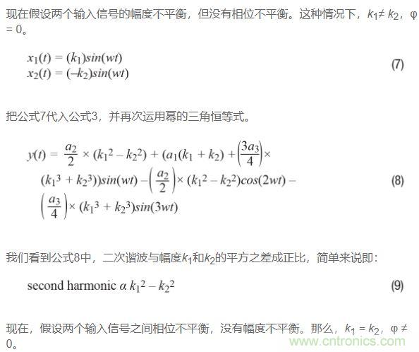 如果回過頭比較公式9和公式12,并且假設三角恒等式運用正確,那么可以得出如下結論:二次諧波受相位不平衡影響比受幅度不平衡影響更嚴重。原因如下:對于相位不平衡,二次諧波與k1的平方成正比;再看公式12,對于幅度不平衡,二次諧波與k1和k2的平方差成正比,或看公式9。由于k1和k2大致相等,因此這種差異通常很小,特別是如果將其與平方數(shù)進行比較!