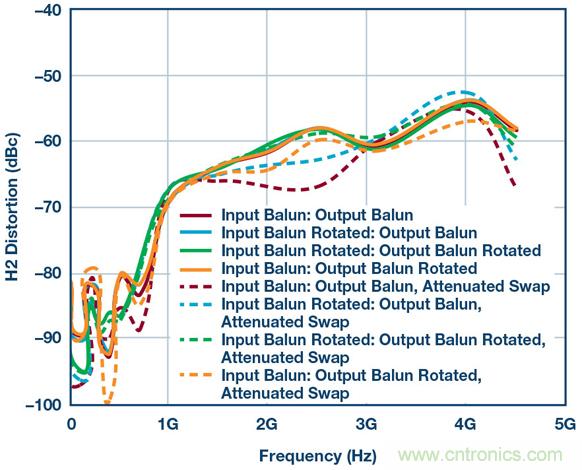 乍一看相當簡單,但魔鬼隱藏在細節(jié)中。圖3顯示了一組HD2測試結果,其系使用本框圖中的所有器件、差分放大器、巴倫、衰減器等得到的。這些測試證明:僅僅用不同方式翻轉(zhuǎn)巴倫方向所導致的細微相位不匹配,便能在HD2掃頻中產(chǎn)生不同結果。此設置中有兩個巴倫,因此通過顛倒設置一側(cè)或兩側(cè)的連接可以創(chuàng)建四種可能的場景。結果如圖3所示。