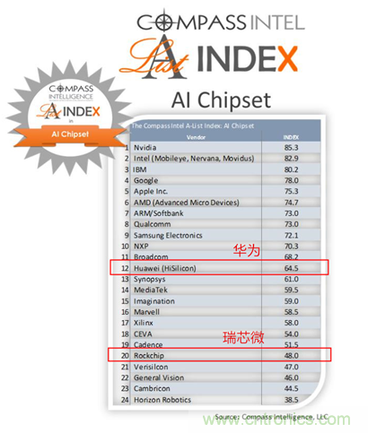 前不久,市場研究公司Compass Intelligence發布了全球AI芯片企業排名。Compass Intelligence是從公司表現、產品表現、市場表現、獨特市場四大維度計算出了這一結果。