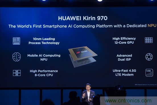 2017年9月,華為在德國柏林國際電子消費品展覽會(IFA)上正式推出其最新 AI 芯片 “麒麟 970”(Kirin 970)。麒麟 970集成 NPU 專用硬件處理單元(寒武紀IP),創新設計了 HiAI 移動計算架構,其 AI 性能密度大幅優于 CPU 和 GPU。10月,華為在德國慕尼黑發布了搭載麒麟 970的新款旗艦手機Mate 10,最主要的賣點便是人工智能。NPU新架構讓華為手機在處理同樣的AI任務時,得到了50倍能效和25倍性能提升。
