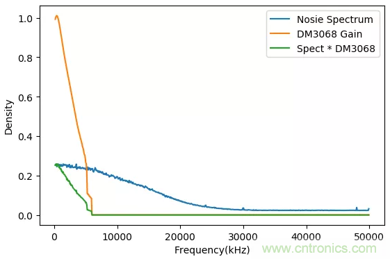 隨機信號頻譜(藍色),DM 3068頻譜特性(黃色),實際測量隨機噪聲各頻率分量的數值(綠色)