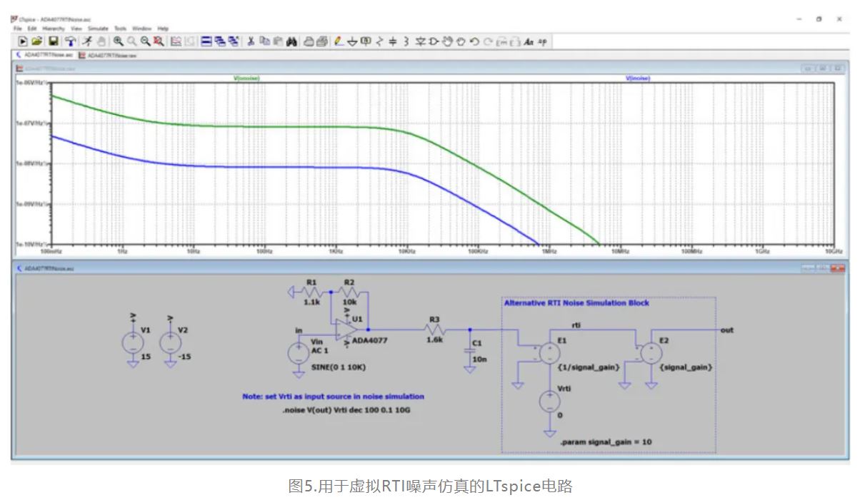 LTspice的多功能性和準確性使其對噪聲仿真非常有用。輸出節(jié)點和輸入源在噪聲仿真命令中指定,輸出噪聲(RTO)是查看分析結果的默認方式。LTspice還會根據(jù)RTI的傳統(tǒng)定義計算參考到指定輸入源的輸入噪聲,但如圖4所示,對傳統(tǒng)RTI噪聲進行積分無法提供有意義的結果。圖5顯示了如何在LTspice的輸出中添加一級,以便仿真器返回替代的虛擬RTI噪聲。運行仿真后,在選定圖形的情況下,從Plot Settings—Add Trace將輸入噪聲添加到圖形中,然后選擇V(inoise)。這會將輸入噪聲添加到圖形中。曲線形狀與輸出噪聲相匹配,表明整個電路的頻率響應都得到了考慮。在按住ctrl鍵的同時左鍵單擊圖形中標題為"V(inoise)"的曲線,以對總RTI噪聲進行積分。