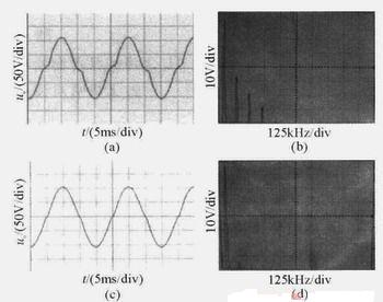 在實(shí)驗(yàn)中,開關(guān)頻率為10kHz,正弦波頻率為50Hz,取L1=1.15mH,L2=0.1mH,C=90μF,負(fù)載為純阻性,滿載時(shí)為8歐姆,死區(qū)時(shí)間Td設(shè)置為2μs。