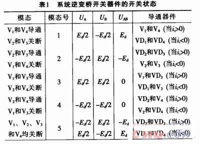 在采用IGBT作為開關(guān)器件的單相橋式PWM逆變電路中,假設(shè)負(fù)載為阻感負(fù)載。工作時(shí)V1和V2的通斷狀態(tài)互補(bǔ),V3和V4的通斷狀態(tài)也互補(bǔ)。逆變橋的主回路由左右橋臂組成,每個(gè)橋臂有兩個(gè)IGBT,每一個(gè)開關(guān)器件都有一個(gè)PWM波控制其導(dǎo)通,且同一橋臂上的兩功率開關(guān)器件不能同時(shí)導(dǎo)通,否則會(huì)導(dǎo)致直流電壓短路。考慮到在感性負(fù)載下二極管VD1、VD2、VD3、VD4存在著續(xù)流的現(xiàn)象,且逆變橋同一橋臂上的兩個(gè)IGBT不能同時(shí)導(dǎo)通,所以在逆變電路中存在著五種開關(guān)狀態(tài),具體情況如表1所示。單相橋式刪逆變電路如圖1所示。