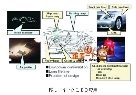LED已經(jīng)廣泛的應(yīng)用于車內(nèi)的相關(guān)照明或指示用光源,由圖1可知,從車內(nèi)的儀表板燈、車頂燈、化妝燈、迎賓燈等,到車外的尾燈、前后轉(zhuǎn)向燈、倒車燈、第三剎車燈等都可見到LED的相關(guān)應(yīng)用。