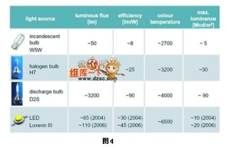 目前使用于車上的燈源可區(qū)分為白熾燈泡、鹵素?zé)襞荨怏w放電式燈泡與LED光源,其比較如圖4所示。