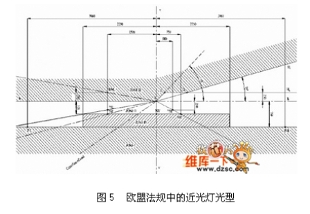 光學(xué)設(shè)計時先考慮法規(guī)需求,討論視角與強度關(guān)系,以近燈為例須針對其特殊的15度揚角設(shè)計,如圖5所示。在傳統(tǒng)的燈具設(shè)計上由先期的利用反射罩配合透鏡刻紋作角度與強度的控制,演變成為利用反射罩直接控制強度角度,也發(fā)展出利用成像方式的魚眼透鏡設(shè)計法。不論何種的設(shè)計方式都須先考慮選用光源的特性,特別是角度與強度的光型輸出(Beam pattern),對傳統(tǒng)的光源而言,大多為柱狀光源,可產(chǎn)生類似蝴蝶外型的光型輸出,進(jìn)而發(fā)展出來與之搭配的透鏡、反射罩、擋板、透鏡等光學(xué)組件。而利用LED作為光源設(shè)計燈具時,需重新考慮其光學(xué)特性由傳統(tǒng)的柱狀光源變?yōu)槠矫婀庠矗ú煌姆庋b設(shè)計有不同的光型輸出),進(jìn)而搭配外部的光學(xué)組件而產(chǎn)生不同組合以應(yīng)用于不同產(chǎn)品,依照德國車燈大廠HELLA的設(shè)計分類,可將光源分為八大類,如圖6 所示。LED目前的單位面積發(fā)光量尚不及鹵素?zé)襞菖c放電式燈泡,想得到相同的流明輸出,LED需要較大的封裝面積。隨著光源輸出面積的增加,光學(xué)設(shè)計的難度也隨之提升,所以在現(xiàn)有的概念車上,都以模塊化光學(xué)設(shè)計取代既有的單一燈室設(shè)計,利用多組燈源達(dá)到傳統(tǒng)燈具的照明水平,除了降低光學(xué)設(shè)計的難度,也增加車體造型的設(shè)計感。