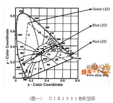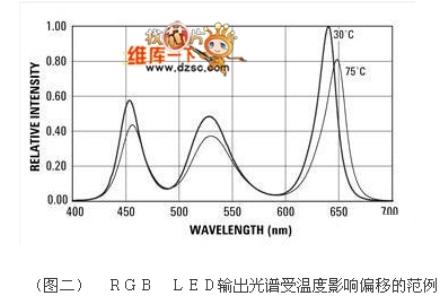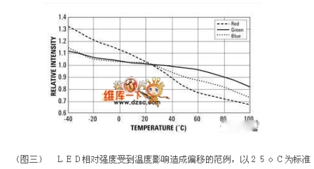 這類LED光源的簡單開迴路架構方式有個潛在的問題,由于LED的光學特性會受到運作條件的影響,因此組合后的RGB光源輸出的亮度以及色度都會變化。同時,每顆LED元件也不盡相同,因此造成RGB光源的輸出產生更多變化,(圖二)與(圖三)就描述了幾個LED變動的范例。