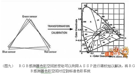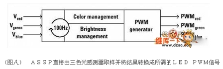 ASSP整合了一系列可以分析三色光感測器色彩資訊,并計算達成目標色的設定點及PWM驅動信號大小的一系列演算法。ASSP以大約每秒一百次的速度對光感測器進行取樣,以確保PWM信號的持續定期調整不會被人眼察覺,如前面所提,ASSP同時也包含一個可以避免LED老化而造成RGB光源輸出色度改變的演算法。