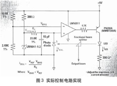 圖2示出采用運(yùn)放的電路,用于分析控制環(huán)路。此電路驅(qū)動(dòng)1個(gè)PNP晶體管,此晶體管為產(chǎn)生光發(fā)射的LED提供電流。光發(fā)射照射到光電二極管,光電二極管把光發(fā)射轉(zhuǎn)換為非常小的電流(通常為10mA)。在這種情況下,二極管用在反向模式,所以在無光呈現(xiàn)時(shí),電流為零,但是光電二極管和放大器中的漏電流(也稱之為“暗電流”)是過載。此條件牽引由晶體管基極電阻所限制的電流,開始時(shí)晶體管處于飽和狀態(tài)。一旦電流開始流經(jīng)晶體管,則LED或激光二極管將開始發(fā)射光。光電二極管把此部分光轉(zhuǎn)換為電流,流經(jīng)RG。隨著電壓趨于VBIAS(在圖2中為地),環(huán)路將閉合并保持驅(qū)動(dòng)晶體管的電流來維持LED中的電流以保持恒定光強(qiáng)度(或光電二極管中的電流)。此構(gòu)成電路DC分析的基礎(chǔ)。圖3為用NS公司LMV2011精密運(yùn)放實(shí)際實(shí)現(xiàn)電路。用NS的LM4041-1.2并聯(lián)基準(zhǔn)產(chǎn)生基準(zhǔn)電壓,提供固定的1.225V基準(zhǔn)電壓。設(shè)置基準(zhǔn)中的電流在10mA左右,這是工作電流的中間值。由兩個(gè)1%精度電阻器產(chǎn)生VBIAS,其值設(shè)置在1V左右。為了計(jì)算閉合控制環(huán)路中的光電二極管電流,VREF和VBIAS之差除RG。注意,為了此電路工作,VBIAS必須小于VREF。對于10mA光電二極管電流,RG為0.2×10E-6或 20.0KΩ。4.7KΩ電阻器限制PN200A PNP晶體管基極電流,設(shè)置在1mA左右。晶體管b值為100左右,所以晶體管可提供的最大電流為100mA左右,這超過了微型SOT-23封裝的熱耗。為了避免晶體管的熱擊穿,用與LED或激光二極管串聯(lián)的電阻器限制晶體管集電極電流。若需要更大電流,則具有較大集電極電流的晶體管應(yīng)該用較大的封裝(如SOT-223)。為限制電路帶寬以保持穩(wěn)定性,用與光電二極管并聯(lián)的15pF電容器使放大器滾降頻率在250KHz左右。