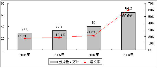 圖1 2005-2008年中國OLED產(chǎn)業(yè)出貨量及增長率