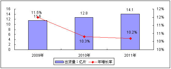 圖2 2009-2011年中國中小尺寸液晶面板出貨量規模預測