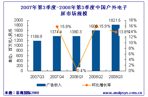 據易觀國際最新報告《2008年第3季度中國戶外電子屏廣告市場季度監測》研究結果顯示:2008年第3季度戶外電子屏廣告市場收入規模為18.21億,環比增長13.8%,同比增長53.5%。