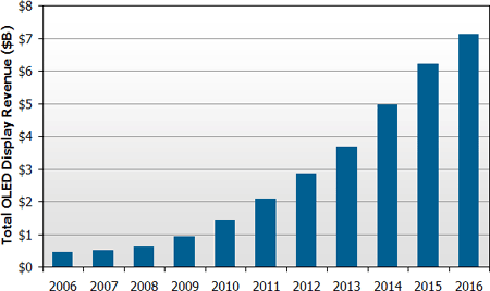 DisplaySearch更指出,在2009年第一季全球AMOLED(主動矩陣式有機發光二極管)的營收首次超越PMOLED(被動矩陣式有機發光二極管)。以目前來看,AMOLED營收的大幅成長主要是由于AMOLED大量應用在手機與個人媒體播放器的主要屏幕上,像是 Nokia(諾基亞)、Samsung(三星)、Sony-Ericsson(索尼愛立信)等知名品牌在2009上半年強烈銷售AMOLED手機,自2009年初以來全球已經有超過10款搭載AMOLED屏幕的手機在市場上推出。