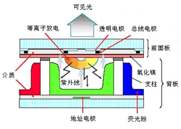 PDP是Plasma Display Panel的簡寫,也就是等離子體顯示器。PDP顯示器的工作原理是,通過加電,讓等離子汽體(一般為惰性氣體)在強電場中放電產生紫外線,然后通過紫外線激發熒光粉發光,PDP顯示器的工作原理如圖5所示,其結構如圖6所示。