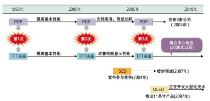 在液晶顯示器市場剛開始啟動的1998年,當時的夏普公司社長(現任董事長)町田勝彥的發言震驚了整個行業。他表示: “到2005年,夏普在日本國內銷售的電視將全部采用液晶屏。” 當時,液晶電視并未普及,在夏普公司內部對于彩色液晶屏也并沒有十足的把握。但是,這一句話成為液晶電視掃蕩市場的導火索,那以后,液晶電視以超乎町田勝彥預想的驚人速度推廣開來。在此過程中,液晶與PDP(等離子)、SED(表面傳導電子發射顯示)等技術展開了激烈的競爭(見圖3)。