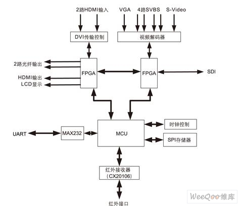 根據LED顯示屏需具有較高的顯示性能和效果,以及方便控制的需求,顯示屏控制系統應具有足夠的輸入、輸出接口和遠程通信功能。我們基于HDMI1.3技術的LED顯示屏控制器的系統結構如圖1所示。系統按功能可分為以下幾個模塊:6路模擬量輸入、2路DVI輸入、1路VGA輸入、RS-232和RS-485通信、光纖數據傳輸、實時時鐘以及狀態指示等。