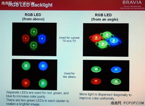 首先從RGB三色LED的排列順序上來看,新一代的“動態(tài)麗彩LED背光源”采用了正方形排列,上下的LED顆粒不再像上一代那樣交錯分列,這樣的排列方式可以將整個屏幕實(shí)現(xiàn)更為精確的區(qū)域劃分,為下一步的區(qū)域條光埋下伏筆。