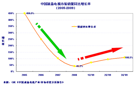 - 到2009年3季度,中國液晶電視市場銷量規模同比增長超過100%