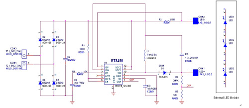 新款RT8450,可專門設計在MR16LED燈的驅動應用中,其內部電路設計架構可易于實現升降壓電路,如圖1所示。