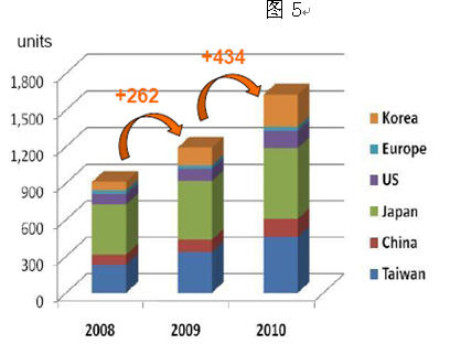 晶粒方面,預(yù)估全球MOCVD數(shù)量逐步增加(圖5),其中以韓國(guó)和臺(tái)灣廠商最為積極,Samsung, LG Innotek以及AUO旗下的Lextar都將增加MOCVD機(jī)臺(tái)數(shù)量至目前的2~3倍。到2010年底,預(yù)計(jì)全球高亮度LED晶粒月產(chǎn)能將接近200億,但目前市場(chǎng)應(yīng)用仍以移動(dòng)終端產(chǎn)品和汽車(chē)照明用為主,前兩者的應(yīng)用比重高達(dá)55%,但TV用背光源應(yīng)用比重總體仍將難突破20%,因此背光源缺貨狀況的緩解將需要較長(zhǎng)時(shí)間。